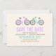 Inbjudningar till snyggt och roligt är en vacker illustration av två cyklar i mjuk pastel färg perfekt för vår eller sommar bröllop. Använda dessa för bröllop, möhippor, möhippor, spara datum meddelande, förlovningsfester och mer!