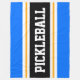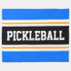 Den här sportetiska, atletiska designen har fet PICKLEBALL-text inuti ett markerat svart rand med dubbla vit och gult tävla ränder mot ljusblå yttre ränder. Texten i den här designen kan vara personlig.