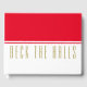 Den här helgdag i roligt har ett ljusrött övre halva färg-block med matchande vitt streck nära grund kant mot en skarp, vit bakgrund. Den långa, smala, gulbruna texten i det vita färg-blocket spådomar ut "DECK THE HALLS" och kan vara personlig.