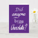 Denna roliga "brakt på fötter"-kortets ordkonst typografi gratulationskort presenterar en av de viktigaste frågorna någon kan ställa "Tog någon med sig choklad?" Den här roliga chokladcitatet är perfekt för chokladälskaren i ditt liv. Handskrivet chokladcitat humor kvickhet slogan och design av The Sweetmans