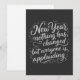 Sarkastiskt nyårscitat i elegant handstil: "Ingenting har förändrats men alla applåderar." Perfekt för cyniker och humorälskare