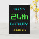 Den här enkla och roligt-hälsningskortet har ett meddelande som "LYCKLIG 24:e BIRTHDAY, JENNIFER!". Den har också en roligt som är inspirerad av digital datoranvändning. Namn på framsidan och meddelandet på insidan kan anpassas. Den kan skickas eller ges till någon som firar sin tjugofjärde födelsedag och som kanske arbetar (eller arbetar före pension) som datorprogrammerare, utvecklare av software, databasadministratör, nätverksadministratör, elektronik ingenjör eller som på annat sätt har nytta av att använda datorer. [~Z0000100]