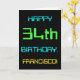 Den här enkla och roligt-hälsningskortet har ett meddelande som "LYCKLIG 34:e BIRTHDAY, FRANCISCO!". Dess utseende inspireras av fält i den digitala datoranvändningen. Namn på framsidan och meddelandet på insidan kan vara personlig. Den kan skickas eller ges till någon som firar sin trettiofjärde födelsedag och som kanske arbetar (eller arbetar före pension) som systemadministratör, datorprogrammerare, nätverksadministratör, elutvecklare, software eller som på annat sätt har nytta av att använda datorer. [~Z0000100]