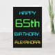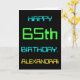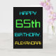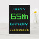 Den här enkla och roligt-hälsningskortet har ett meddelande som "LYCKLIG 65e BIRTHDAY, ALEXANDRA!". Dess utseende inspireras av fält i den digitala datoranvändningen. Namn på framsidan och meddelandet på insidan kan vara personlig. Den kan skickas eller ges till någon som firar sin sextiofemte födelsedag och som kanske arbetar som datorprogrammerare, utvecklare av software, databasadministratör, nätverksadministratör, elektronik ingenjör eller som på annat sätt har nytta av att använda datorer. [~Z0000100]