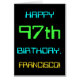 Den här enkla och roligt hälsningskortet har ett meddelande som "LYCKLIG 97:e BIRTHDAY, FRANCISCO!". Dess utseende inspireras av fälten av digital datoranvändning. namn på framsidan och meddelandet på insidan kan anpassas. Den skulle kunna skickas eller ges till någon som firar sin 97:e födelsedag och som kanske arbetar (eller arbetade före pension) som databasadministratör, datorprogrammerare, nätverksadministratör, utvecklare av software, en elektrisk ingenjör eller som på annat sätt tycker om att använda datorer. [~Z0000100]