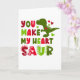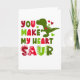 En grön dinosaurie, rosa och röda hjärtan och färgrik text läser: Du får mitt hjärta att sauro.