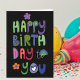Kortet har ord "Grattis på födelsedagen till dig" i fetstilt typografi och vibrerande färg, skapar det en roligt och ett festligt sätt att fira en minnesvärd dag. Texten inuti kan antingen redigeras eller tas bort helt.