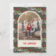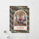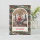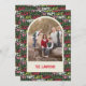 Roligt moderna fotohelgdagskort med bakgrunden mönster av färglöst festivt ord "kärlek, ljus, fred, glädje, hopp" i rött, gröntens rosa och benvit. Överlagt är ditt foto i en bågform. Signera med rött teckensnitt. Baksidan har samma roligt som mönster som framsidan.