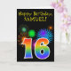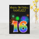 På framsidan av den här roligten har den rovgiriga prickkortsdesignen ett färgstarkt berömmande fyrverkeri inspirerat mönster, tillsammans med siffran "16" med en flerfärgad regnbåge som mönster, på en svart färgad. På fronten finns också ett meddelande om födelsedagen hälsning, inklusive ett anpassade som tar emot namn. Insidan innehåller ett hälsning-meddelande från anpassadets födelsedag, eller kan kanske tas bort och lämnas tomt om ett meddelande ska skrivas för hand i stället. Ett sådant här födelsedagskort i anpassadet kan vara ett roligt för att skicka ett meddelande i firande om någons sextonårsdag. [~Z0000330]