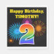 Den här roligten har en sjudande papper napkin-design med ett färgstarkt berömmande fyrverkeripjäs inspirerat mönster, tillsammans med siffran "2" med ett flerfärgat regnbågsinspirerat mönster, på en svart färgad. Den innehåller också ett eget namn och ett händelsemeddelande. Pappra servetter av detta slag kan användas vid ett party som hålls för att fira någons andra födelsedag. [~Z0000326]