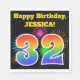 Den här roligten har en sjudande papper napkin-design med färgstarka berömmande fyrverkerier som inspirerat mönster, tillsammans med siffran "32" med ett flerfärgat regnbågsinspirerat mönster, på en svart färgad. Den innehåller också ett eget namn och ett händelsemeddelande. Pappra servetter som denna kan användas vid ett party som hålls för att fira någons trettioandra födelsedag. [~Z0000326]