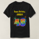 Den här roligten har en slimmad skjorta med färgstarka, högljudda fyrverkerier som inspirerat mönster, tillsammans med siffran "45" med en flerfärgad regnbåge som spektrum eller övertoning mönster. Det innehåller också ett personlig namn och ett händelsemeddelande, t.ex. en Grattis på födelsedagen-födelsedag i hälsning. En sådan skjorta kan bäras av gästerna vid en födelsedagsfest som hålls för att fira någons fyrtiofemårsdag. [~Z0000332]