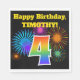 Den här roligten har en sjudande papper napkin-design med ett färgstarkt berömmande fyrverkeripjäs inspirerat mönster, tillsammans med siffran "4" med ett flerfärgat regnbågsinspirerat mönster, på en svart färgad. Det innehåller också ett anpassade namn och ett händelsemeddelande. Pappra servetter av detta slag kan användas vid ett party som hålls för att fira någons fjärde födelsedag. [~Z0000326]