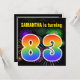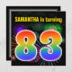 Den här roligten har en sjudande födelsedagsfest inbjudan-design med färgstarka brinnande högljudda fyrverkerier som inspirerat mönster, tillsammans med siffran "83" som innehåller ett flerfärgat regnbågsinspirerat spektrum eller övertonande mönster. Namn på framsidan kan anpassas. Baksidan innehåller information om anpassadet om party. Födelsedagsfest inbjudan som detta kan skickas till potentiella deltagare för en födelsedagsfest som hålls för att fira någons åttio tredje födelsedag. [~Z0000337]