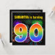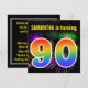 Den här roligten har en sjudande födelsedagsfest inbjudan-design med ett färgstarkt mönster som inspirerats av brinnande berömda fyrverkerier, tillsammans med talet "90" med ett flerfärgat regnbågsinspirerat spektrum eller gradient mönster. Namn på framsidan kan vara personlig. Baksidan innehåller information om anpassadet om party. Födelsedagsfest inbjudan som detta kan skickas till gäster från inbjudan till en födelsedagsfest som hålls för att fira någons nittioårsdag. [~Z0000337]