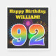 Den här roligten har en sjudande papper napkin-design med färgstarka högtalande fyrverkerier som inspirerat mönster, tillsammans med siffran "92" med ett flerfärgat regnbågsinspirerat mönster, på svart färgad. Den innehåller också ett eget namn och ett händelsemeddelande. Pappra servetter som denna kan användas vid ett party som hålls för att fira någons nittio andra födelsedag. [~Z0000326]