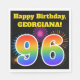 Den här roligten har en sjudande papper napkin-design med färgstarka, berömmande fyrverkerier som inspirerat mönster, tillsammans med siffran "96" med en flerfärgad regnbåge som mönster, på en svart färgad. Det innehåller också ett personlig namn och ett händelsemeddelande. Pappra servetter som denna skulle kanske kunna användas vid en födelsedagsfest som hålls för att fira någons nittiosjätte födelsedag. [~Z0000326]