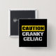 Roligt-knappmärke med varningstecken som säger Caution Celiac.