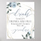 Dammt blå blommor som passar din bröllopstema, Roliga skyltar för öppet bar på din mottagning - Dagens drinkar är gratis, morgondagens historier kommer att vara ovärderliga! . Akvarellrosor, blad och bär i modern chic dammig blå omger en geometrisk terrarium-stil förgylld ram med salvia grönska. Anpassa text, typsnitt, färg och storlek. Originalkonst skapad för BarefootBride ™ av © WhimsicalArtwork ™ - Det här är en del av en komplett bröllopspresent med matchande bröllop, baby shower och andra evenemangsinbjudningar.
