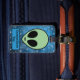 Perfekt resgodsbagagetapp för en extra-landsänd, utomjordisk, rymdentusiast. En grönt utomjording ansikte med stort svart öga och en liten bit för munnen på en blå rymdbakgrund som prickas med vita stjärnor. Under utlänningen finns ett utrymme där du kan lägga till ditt namn för att anpassa. På baksidan finns mallar för att lägga till information så att väskan aldrig får borttappad igen.