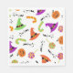 Roligt Halloween papper napkin med candies, pumpor and witches hats i orange, grönt och lila på vit bakgrund. Den här napkin skulle vara underbar för en Halloween-födelsedagsfest eller Halloween fest.