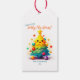 "Ha en mycket god jul" säger den roliga tecknaden Julgran med sitt leende ansikte. Det idrottar fromma färg från gult till grönt till teal och blått med en gult stjärna på prydnadsföremål av hög och roligt. Använda den här presentens märkre på helgdag för din lätthjärtade vän eller släkting eller barn. Texten, som är i skript för teal och orange-red, är redigerbar. Se till att byta ut exempeltexten till namn och år mot dina val.