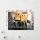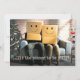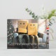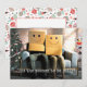 Skicka lite julstämning till vänner och familj i år med detta roliga vykort med ett par som sitter på sin soffa i vardagsrummet omgiven av sina juldekorationer med lådor på huvudet som har leende ansikten ritade på sig. Det lättsamma skämtet och anonymiteten sprider julglädje och kommer att locka ett leende på mottagarnas ansikten. Baksidan av kortet har ett retro-mönster i mid-century modern-stil som kompletterar designen. Anpassa textmallen med dina namn och önskad hälsning - eller så kan du behålla hälsningstexten som den är skriven och bara anpassa namnen. Fotot är tänkt att beställas som det är.