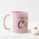 Roligt brunt kaffecitattext på vit och rosa polka punkt mönster.