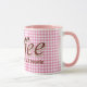 Roligt brunt kaffecitattext på vit och rosa gingham mönster.