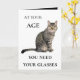 Ett gulligt och roligt födelsedagkort som presenterar en katt med exponeringsglas på bekläda- och vinexponeringsglasen på insidan.