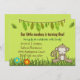 En söt apa som fick födelsedag. En kawaiiapa sitta i gräset med ett par söta blommor. En banderoll med skräppost lämnar överst. Anpassa med information om födelsedagsfesten.