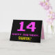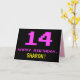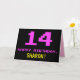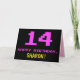 Framsidan av den här roligten, nonsens och högtidliga hälsningskortet har ett stort rosa 14, tillsammans med meddelandet"GRATTIS PÅ FÖDELSEDAGEN," i rosa och en fet anpassade mottagare namn. Texten har ett utseende som inspirerats av det 8-bitars stil-datorspel och videospelsgrafik från 1970- och 1980-talen, och bakgrunden är svart färgad. Insidan har ett hälsning-meddelande på personligens födelsedag, eller så kan det kanske rensas och lämnas tomt om ett meddelande ska skrivas för hand i stället. Ett sådant här födelsedagskort i fåniget kan vara en roligt för att fira någons fjortonde födelsedag. [~Z0000478]