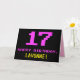 Framsidan av den här roligten, njud- och högtidliga födelsedagen med hälsningskortet har ett stort rosa nummer "17", tillsammans med "GRATTIS PÅ FÖDELSEDAGEN," på rosa och en fet gult anpassade mottagare namn. Texten har ett utseende som inspirerats av vintage 8-bitars stil video-/datorspelgrafik från 1970- och 1980-talen, och bakgrunden är färgad svart. Insidan innehåller ett anpassat hälsning-födelsedagsmeddelande eller kan kanske tas bort och lämnas tomt om ett meddelande ska skrivas för hand i stället. Ett sådant här födelsedagskort i fåniget kan vara ett roligt sätt att skicka ett meddelande i firande om någons sjuttonårsdag. [~Z0000478]