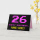 På framsidan av den här roligten har du ett stort nummer "26" och ett meddelande "GRATTIS PÅ FÖDELSEDAGEN," rosa av färgad, tillsammans med en fet personlig av gult som är mottagare namn. Texten har ett utseende som inspirerats av den klassiska 8-bitars stil-datorns/videospelsgrafiken från 1970- och 1980-talet, och bakgrunden är färgadens svart. Insidan har ett anpassat hälsning-födelsedagsmeddelande, eller så kan det kanske rensas och lämnas tomt om ett meddelande ska skrivas för hand i stället. Ett sådant här födelsedagskort i fåniget kan vara ett roligt sätt att skicka ett meddelande med ett firande av någons tjugosjätte födelsedag. [~Z0000478]