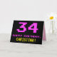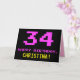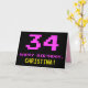 Framsidan av den här roligten, den gäckande och nonsens födelseteckendesignen har ett stort nummer "34" och meddelandet "GRATTIS PÅ FÖDELSEDAGEN," färgad rosa, tillsammans med en fet gult anpassningsbar mottagare namn. Texten har ett utseende som inspirerats av det klassiska 8-bitars stil-grafikobjektet från 1970- och 1980-talen, och bakgrunden är svart på färgad. Insidan innehåller ett hälsning-meddelande från personligens födelsedag, eller kan kanske tas bort och lämnas tomt om ett meddelande ska skrivas för hand i stället. Ett sådant här födelsedagskort i fåniget kan vara ett sätt att skicka ett roligt för att fira någons trettiofjärde födelsedag. [~Z0000478]