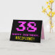 Framsidan av den här roligten, den här gigantiska och neriga födelseteckendesignen har ett stort nummer "38" och meddelandet "GRATTIS PÅ FÖDELSEDAGEN," färgad rosa, tillsammans med en fetstilt gult redigerbar mottagare namn. Texten har ett utseende som inspirerats av den bild av 8-bitars stil-video-/datorspelsgrafik från 1970- och 1980-talen, och bakgrunden är färgadens svarta. Insidan innehåller ett anpassat hälsning-födelsedagsmeddelande eller kan kanske tas bort och lämnas tomt om ett meddelande ska skrivas för hand i stället. Ett sådant här födelsedagskort för fånig personlig kan vara ett roligt sätt att erkänna någons trettioåttonde födelsedag. [~Z0000478]