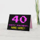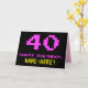 Framsidan av den här roligten, njud- och högtidliga hälsningskortet har ett stort nummer "40" och meddelandet "GRATTIS PÅ FÖDELSEDAGEN," rosa av färgad, tillsammans med en fet gult anpassade mottagare namn. Texten har ett utseende som inspirerats av det klassiska 8-bitars stil-grafikobjektet från 1970- och 1980-talen, och bakgrunden är svart på färgad. Insidan innehåller ett hälsning-meddelande från personligens födelsedag, eller kan kanske tas bort och lämnas tomt om ett meddelande ska skrivas för hand i stället. Ett sådant här födelsedagskort i fåniget kan vara ett roligt för att erkänna någons fyrtioårsdag. [~Z0000478]