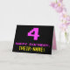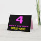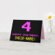 På framsidan av den här roligten har du ett stort nummer "4" och ett meddelande "GRATTIS PÅ FÖDELSEDAGEN," färgad rosa, tillsammans med en fet anpassade som är mottagare av gult, med födelsedag. Texten ser inspirerad ut av den bild som spelgrafik med 8 bitar stil från 1970- och 1980-talen ger, och bakgrunden är svart färgad. Insidan innehåller ett hälsning-meddelande på personligens födelsedag, eller så kan det kanske rensas och lämnas tomt om ett meddelande ska skrivas för hand i stället. Ett sådant här födelsedagskort för fåniget kan vara ett roligt sätt att skicka ett meddelande med ett firande av någons fjärde födelsedag. [~Z0000478]