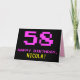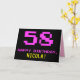 Framsidan av den här roligten, njud- och högtidsfödelsedagen med hälsningskortet har ett stort rosa nummer "58", tillsammans med "GRATTIS PÅ FÖDELSEDAGEN," på rosa och en fet gult personlig mottagare namn. Texten har ett utseende som inspirerats av den klassiska 8-bitars stil-video-/datorspelgrafik från 1970- och 1980-talen, och bakgrunden är svart på färgad. Insidan innehåller ett hälsning-meddelande från anpassningsbarnas födelsedag, eller kan kanske tas bort och lämnas tomt om ett meddelande ska skrivas för hand i stället. Ett sådant här födelsedagskort i fåniget kan vara ett roligt sätt att skicka ett meddelande om att fira någons femtioåttonde födelsedag. [~Z0000478]