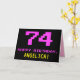 Framsidan av den här roligten, njud- och högtidliga hälsningskortet har ett stort rosa nummer "74", tillsammans med "GRATTIS PÅ FÖDELSEDAGEN," på rosa och en fet gult personlig mottagare namn. Texten har ett utseende som inspirerats av det 8-bitars stil-datorspel och videospelsgrafik från 1970- och 1980-talen, och bakgrunden är svart på färgad. Insidan har ett hälsning-meddelande på anpassningsbarnas födelsedag, eller kan kanske tas bort och lämnas tomt om ett meddelande ska skrivas för hand i stället. Ett sådant här födelsedagskort i fåniget kan vara ett roligt sätt att skicka ett meddelande i firande om någons sjuttiofjärde födelsedag. [~Z0000478]