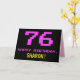 På framsidan av den här roligten, nonsens och högtidlig födelsedag finns det ett stort nummer "76" och meddelandet "GRATTIS PÅ FÖDELSEDAGEN," färgad rosa, tillsammans med en fet gult personlig mottagare namn. Texten ser inspirerad ut av det klassiska 8-bitars stil-datorspelet och videospelsgrafiken från 1970- och 1980-talen, och bakgrunden är svart färgad. Insidan har ett hälsning-meddelande på anpassningsbarnas födelsedag, eller så kan det kanske rensas och lämnas tomt om ett meddelande ska skrivas för hand i stället. Ett sådant här födelsedagskort för fåniget kan vara ett roligt sätt att fira någons sjuttiosjätte födelsedag. [~Z0000478]