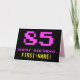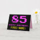Framsidan av den här roligten, gäcket och navelskalendern med hälsningskortet har ett stort rosa nummer "85", tillsammans med "GRATTIS PÅ FÖDELSEDAGEN," på rosa och en fet gult anpassningsbar mottagare namn. Texten ser inspirerad ut av den klassiska 8-bitars stil-dator-/videospelsgrafiken från 1970- och 1980-talen, och bakgrunden är svart på färgad. Insidan innehåller ett hälsning-meddelande från anpassadets födelsedag, eller kan kanske tas bort och lämnas tomt om ett meddelande ska skrivas för hand i stället. Ett sådant här födelsedagskort i fåniget skulle kunna vara ett roligt sätt att skicka ett meddelande i firande om någons åttio femte födelsedag. [~Z0000478]