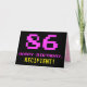 På framsidan av den här roligten har du ett stort rosa nummer "86", tillsammans med meddelandet "GRATTIS PÅ FÖDELSEDAGEN," på rosa och en fet personlig-mottagare namn. Texten har ett utseende som inspirerats av bilden av 8-bitars stil-dator-/videospelsgrafik från 1970- och 1980-talen, och bakgrunden är färgadens svart. Insidan har ett hälsning-meddelande på personligens födelsedag, eller så kan det kanske rensas och lämnas tomt om ett meddelande ska skrivas för hand i stället. Ett sådant här födelsedagskort i fåniget kan vara en roligt för att fira någons åttioårsdag. [~Z0000478]