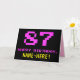 Framsidan av den här roligten, gäcket och navelskalendern med hälsningskortet har ett stort nummer "87" och meddelandet "GRATTIS PÅ FÖDELSEDAGEN," färgad rosa, tillsammans med en fet gult anpassningsbar mottagare namn. Texten har ett utseende som inspirerats av den bild som spelgrafik med 8 bitar stil ger från 1970- och 1980-talen, och bakgrunden är svart på färgad. Insidan har ett hälsning-meddelande på anpassningsbarnas födelsedag, eller kan kanske tas bort och lämnas tomt om ett meddelande ska skrivas för hand i stället. Ett sådant här födelsedagskort i fåniget kan vara ett roligt för att erkänna någons åttio sjunde födelsedag. [~Z0000478]
