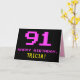 Framsidan av den här roligten, njud- och högtidliga hälsningskortet har ett stort nummer "91" och meddelandet "GRATTIS PÅ FÖDELSEDAGEN," färgad rosa, tillsammans med en fet gult personlig mottagare namn. Texten har ett utseende som inspirerats av den bild av 8-bitars stil-video-/datorspelsgrafik från 1970- och 1980-talen, och bakgrunden är svart på färgad. Insidan innehåller ett redigerbart hälsning-födelsedagsmeddelande, eller så kan det kanske rensas och lämnas tomt om ett meddelande ska skrivas för hand i stället. Ett sådant här födelsedagskort i fåniget kan vara ett roligt sätt att skicka ett meddelande om att fira någons nittioårsdag. [~Z0000478]