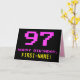 Framsidan av den här roligten, njud- och högtidsfödelsedagen med hälsningskortet har ett stort rosa nummer "97", tillsammans med "GRATTIS PÅ FÖDELSEDAGEN," på rosa och en fetstilt gult redigerbar mottagare namn. Texten har ett utseende som inspirerats av det klassiska 8-bitars stil-datorspel och videospelsgrafik från 1970- och 1980-talen, och bakgrunden är svart på färgad. Insidan har ett redigerbart hälsning-födelsedagsmeddelande, eller så kan det kanske rensas och lämnas tomt om ett meddelande ska skrivas för hand i stället. Ett sådant här födelsedagskort för fånig personlig kan vara ett roligt sätt att erkänna någons nittiosjunde födelsedag. [~Z0000478]