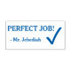 Den här motiverande utformningen av gummi frimärke innehåller det motiverande budskapet "PERFEKT JOBB!" och personligens pedagogiska namn. Den har också en dekorativ bockmarkering. Den skulle kunna användas av en lärare eller en lärare när de markerar uppdrag, för att erkänna att student har gjort bra ifrån sig.