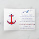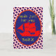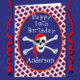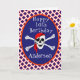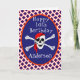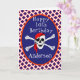 Den här ljusa och roliga födelsedagskortet har en piratskalle med korslagda ben. Piraten bär en röd huvudscarf. På framsidan finns en mall för barnets ålder tillsammans med barnets namn. Piraten och texten är inramade i en stilig ljus marinblå färg. Bilden har en glad marinblå och röd randig bakgrund mot vit yta. Inuti kortet finns ett kedgeankare, mås och nautiska flaggor. Den invändiga hälsningen lyder: Vi önskar dig den lyckligaste, ljusaste framtid du kan ha. Grattis på födelsedagen (VÄNLIGEN ÄNDRA TILL DITT BARNS NAMN), du fantastiska, charmiga pojke (kan ändras till flicka). Skål för fler äventyr att uppleva! Det finns en mall