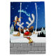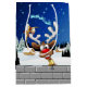 En rolig seriefigur av en ren med en klarröd näsa och stora vita horn, prydd med en röd och gul båge, tittar genom ett öppet fönster. Utanför syns ett snöigt landskap med silhuetter av tallar och ett litet, upplyst hus under en mörkblå, stjärnfylld natthimmel. Jultomtens släde som dras av renar flyger i fjärran. Scenen frammanar en festlig och fantasifull julstämning. Original Vector Art Copyright BluedarkArt TheChameleonArt.