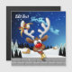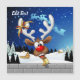 En rolig serieälg med en klarröd näsa och stora vita horn, prydd med en röd och gul båge, tittar genom ett öppet fönster. Utanför syns ett snöigt landskap med silhuetter av tallar och ett litet, upplyst hus under en mörkblå, stjärnfylld natthimmel. Jultomtens släde som dras av renar flyger i fjärran. Scenen frammanar en festlig och fantasifull julstämning. Original Vector Art Copyright BluedarkArt TheChameleonArt.